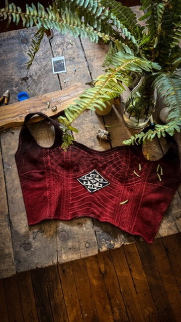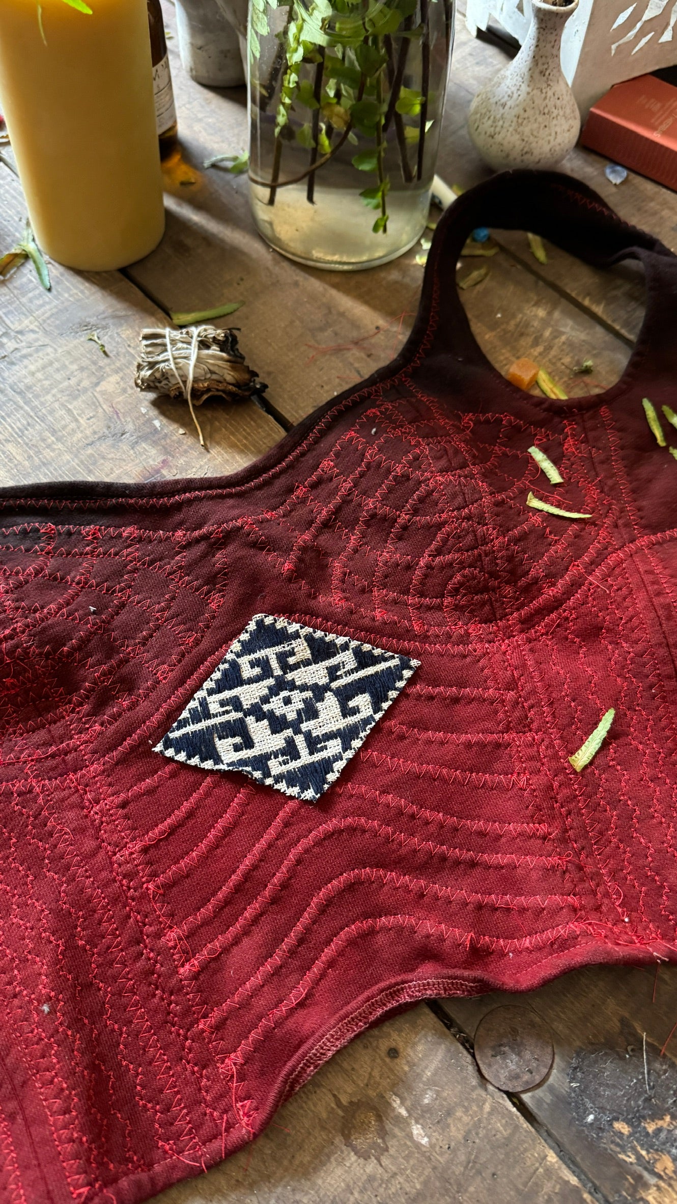 RTS -Fits XS and Small- Continuum Integration-Charcoal Embers Corset Top -Ready to Ship- Hand dyed-70's Vintage Vietnamese Hmong hilltribe woven textile patches