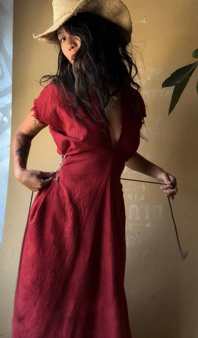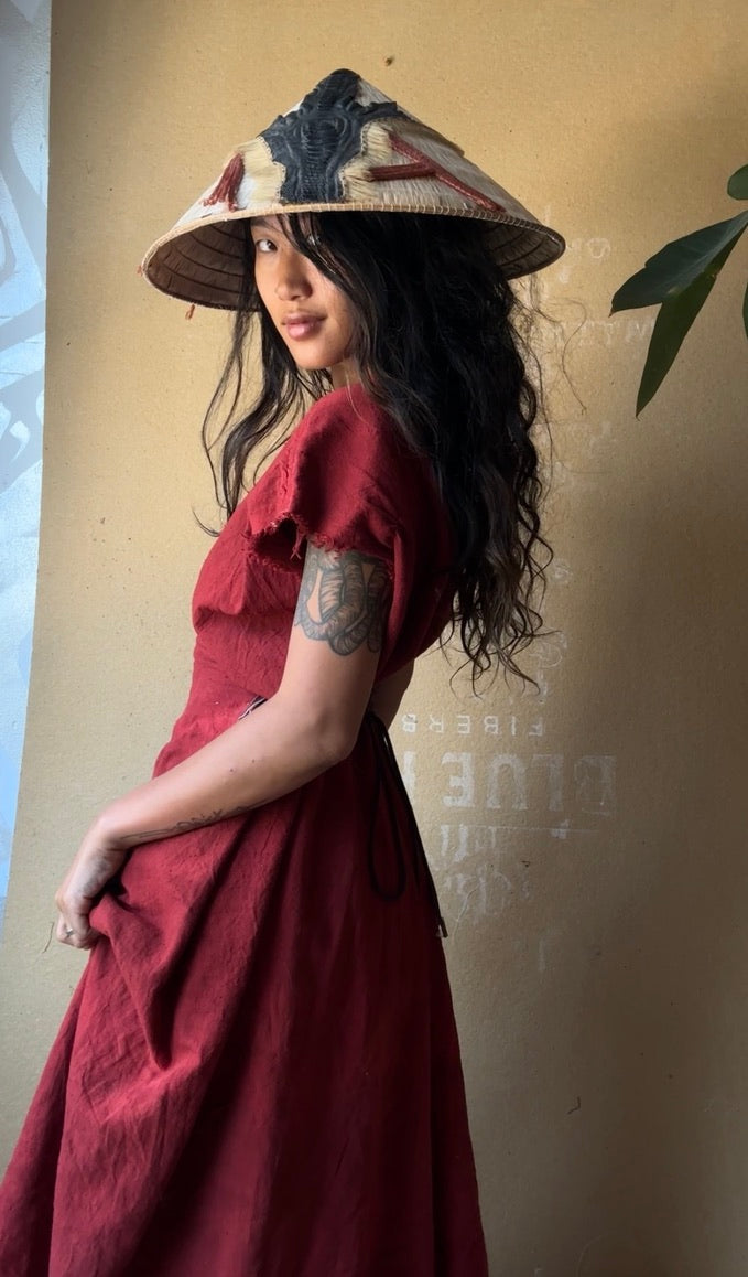 Regular (Fits S/M/L ) Maxi Red Henka Dress - Deadstock Fabric 100% Cotton -70's Hmong Hill tiribe hand woven heritage tapestry Vietnames medium Weight