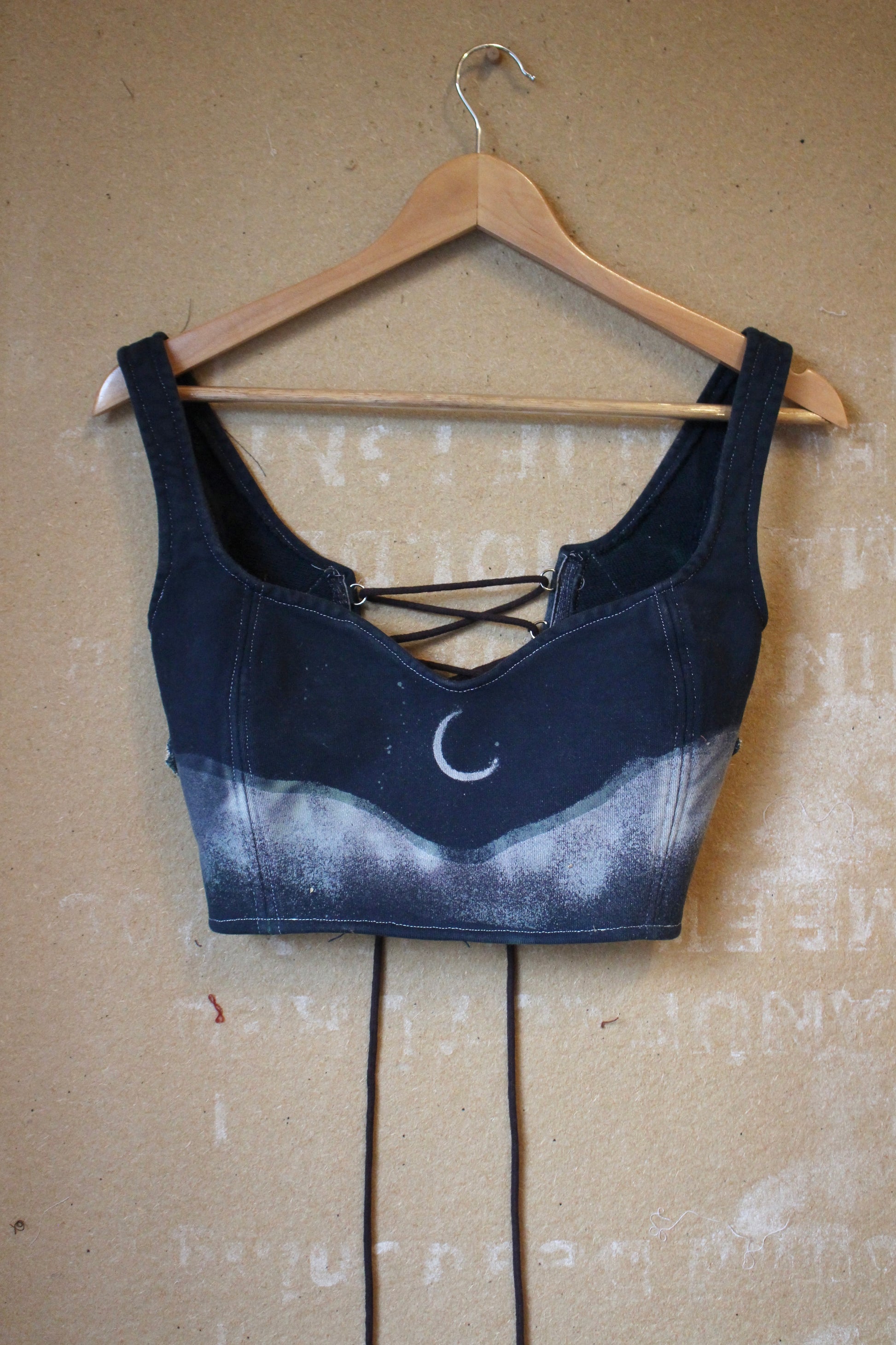 Small Cropped Midnight Corset Bustier Top- 100% Organic Thick heavy weight french terry cotton - with vintage 70's Hmong Hilltribe Vietnamese woven tapestry