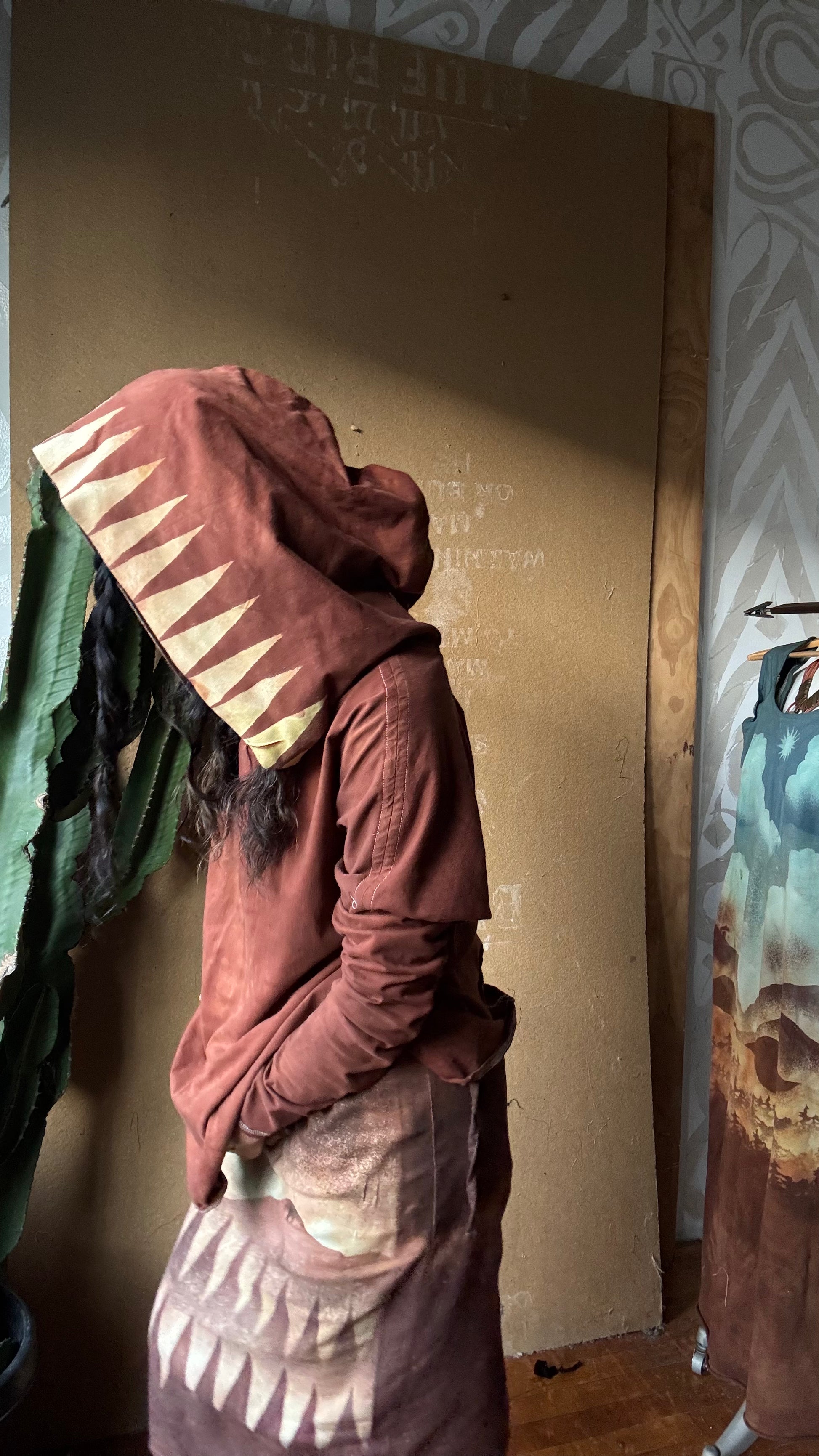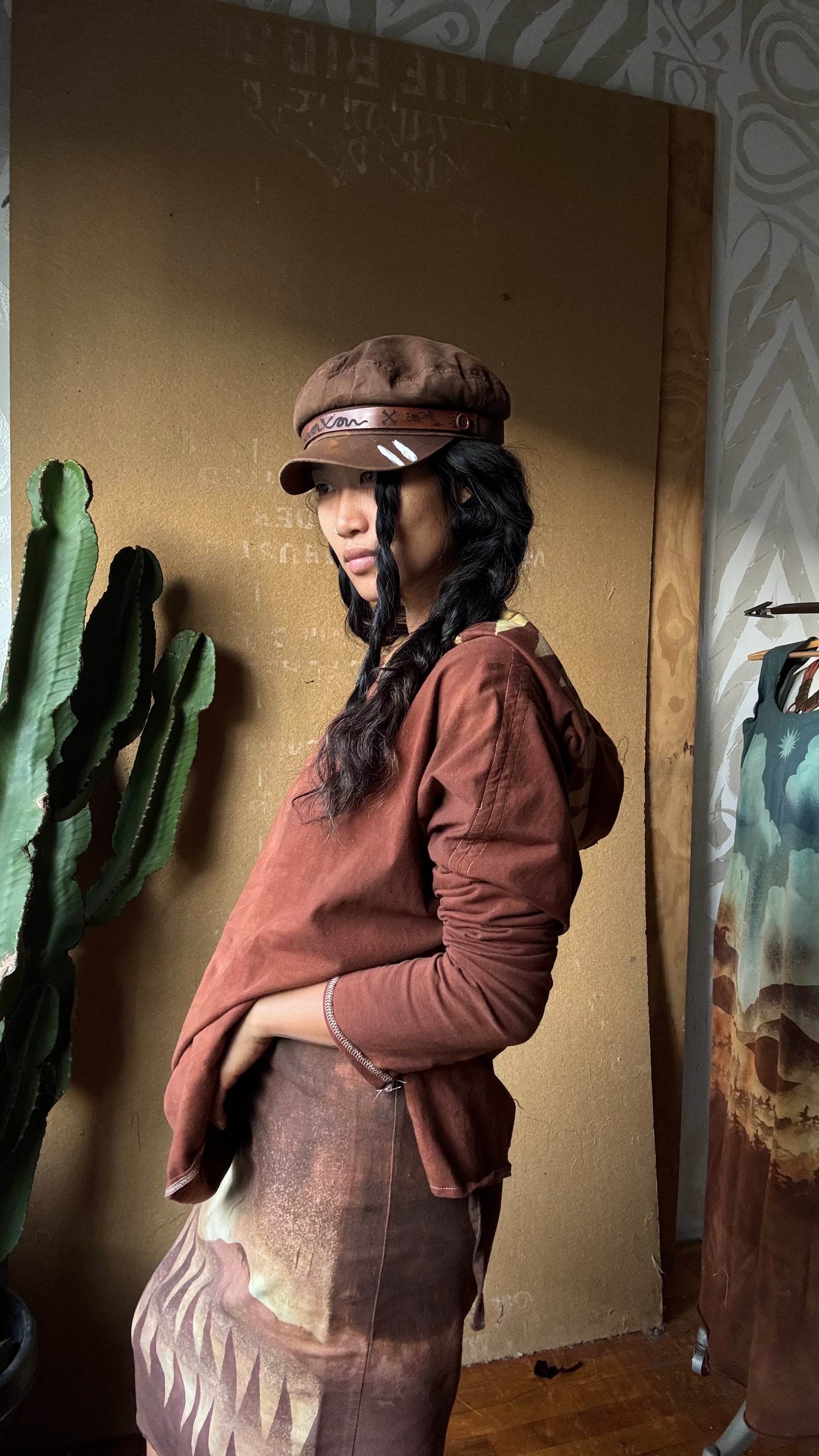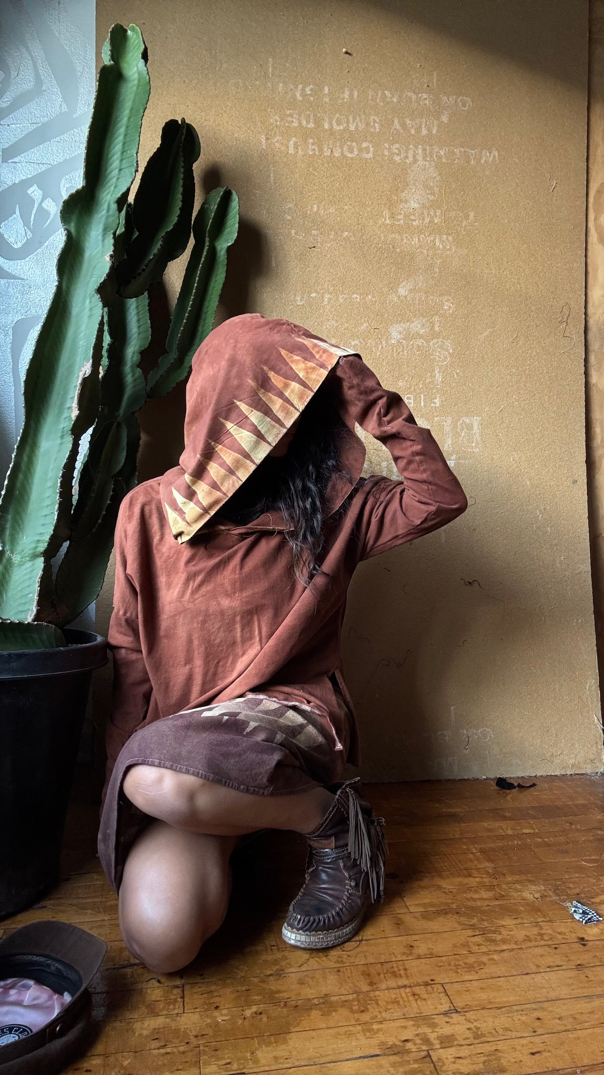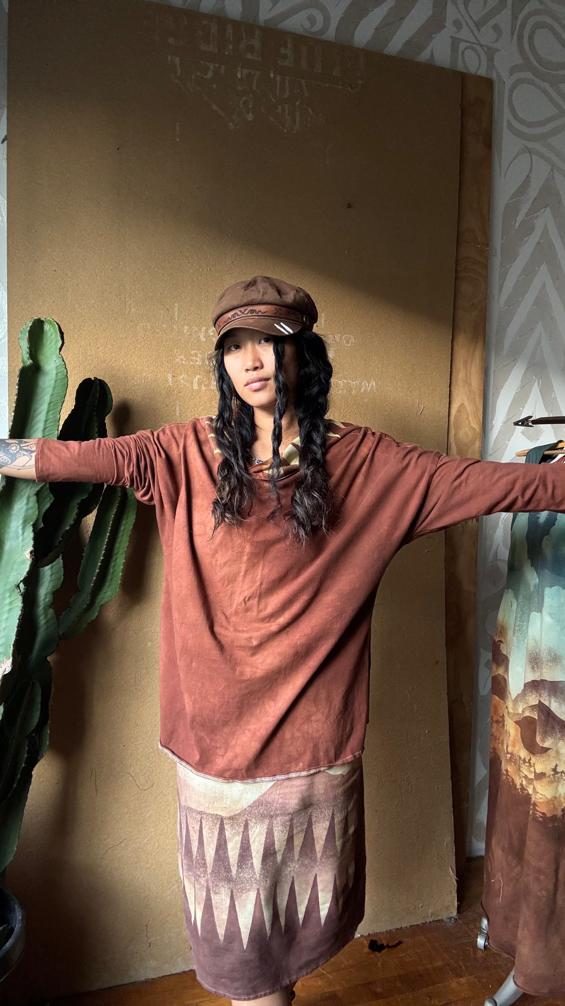 Medium -Terracotta Clay plain solid with Mountain print hood - Slouchy Long sleeve Hoodie - Oversized Hoodie - 100% Triple layered Cotton heavy weight cotton Gauze - Cotton thermal stretch sleeves