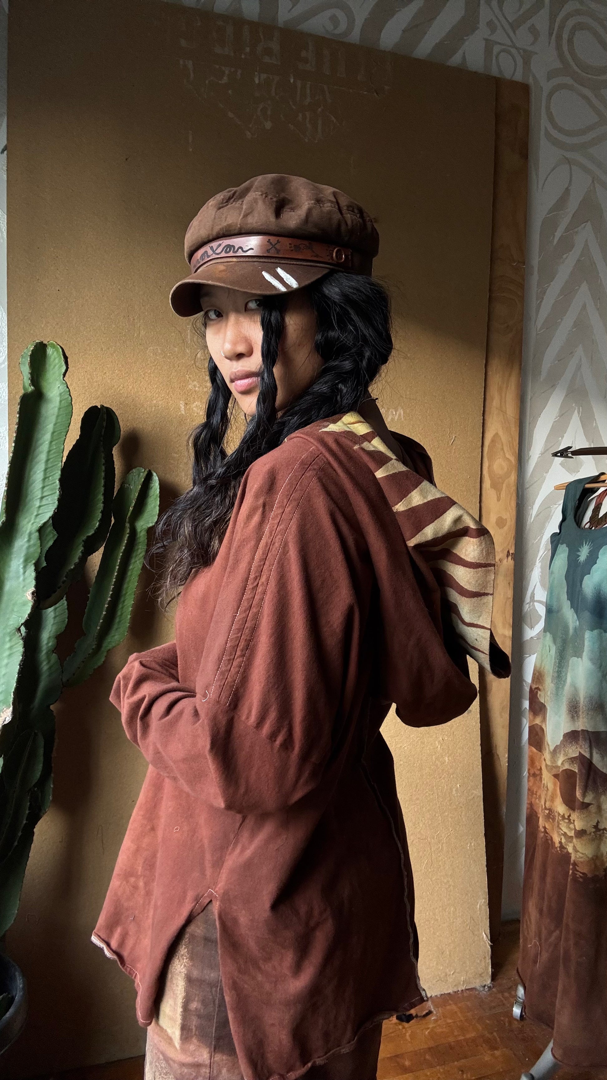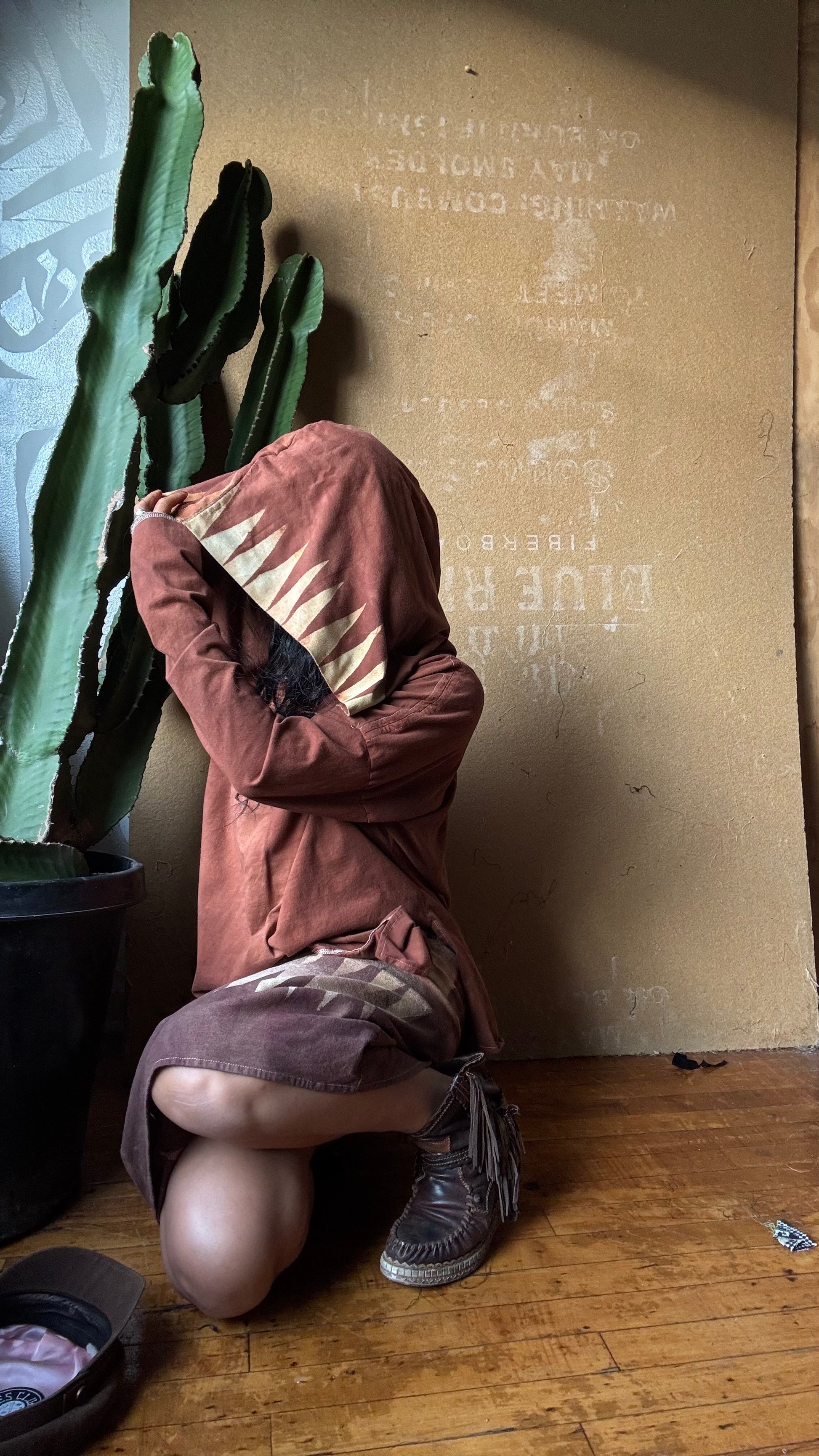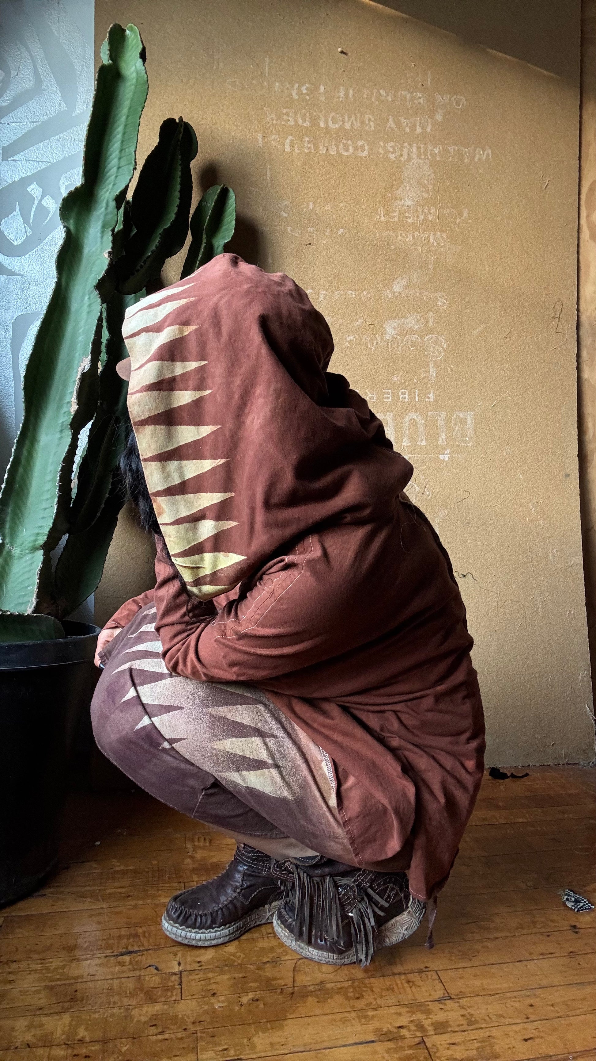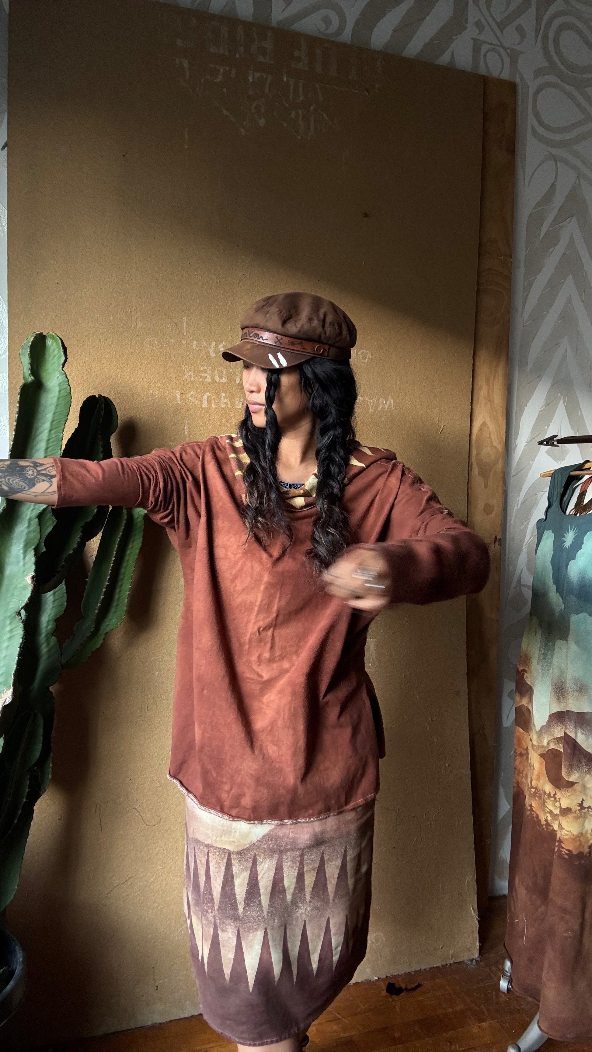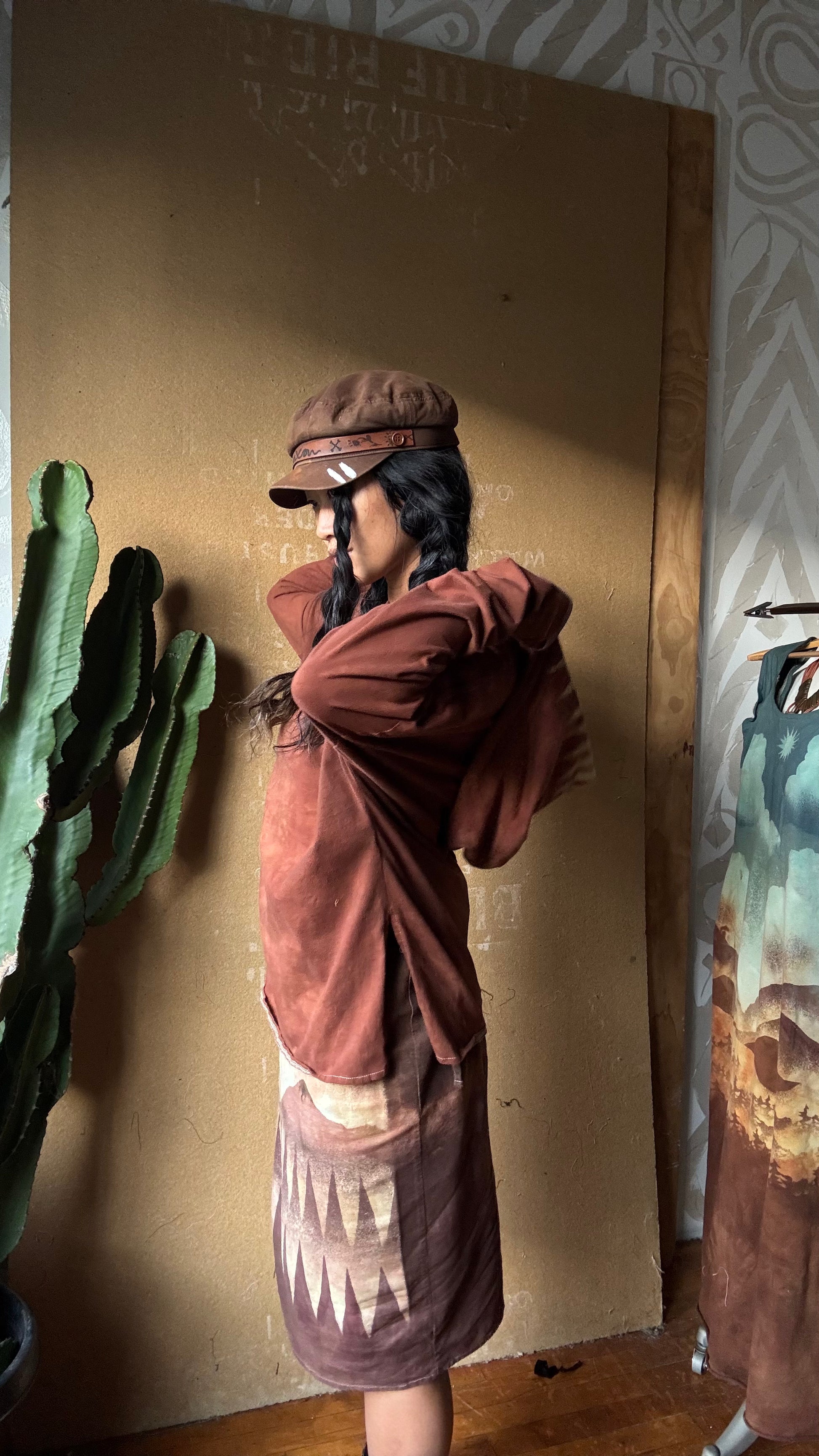 Medium -Terracotta Clay plain solid with Mountain print hood - Slouchy Long sleeve Hoodie - Oversized Hoodie - 100% Triple layered Cotton heavy weight cotton Gauze - Cotton thermal stretch sleeves