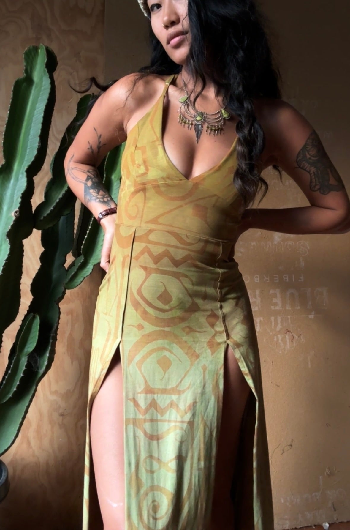 Small - Mustard Lime Glow - Limited series -Darkoski X Zhinh Collaboration Empress Warrior Slit Dress- Screen Printed 66% bamboo, 26% cotton, 8% spandex- Recommended for 5.5ft and under