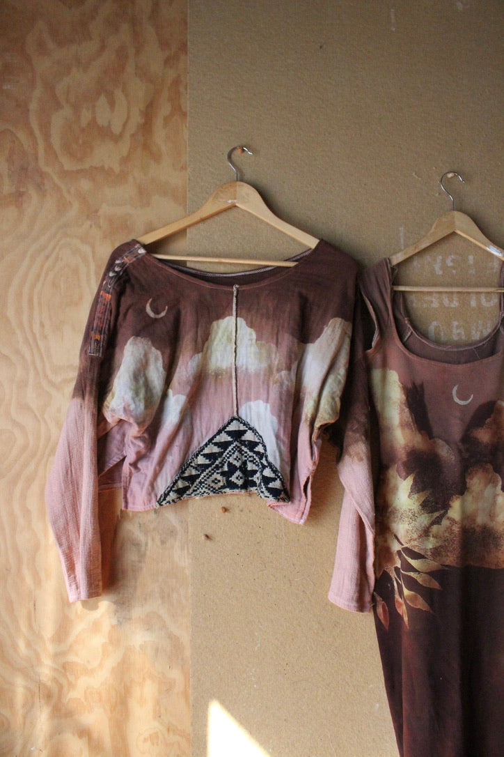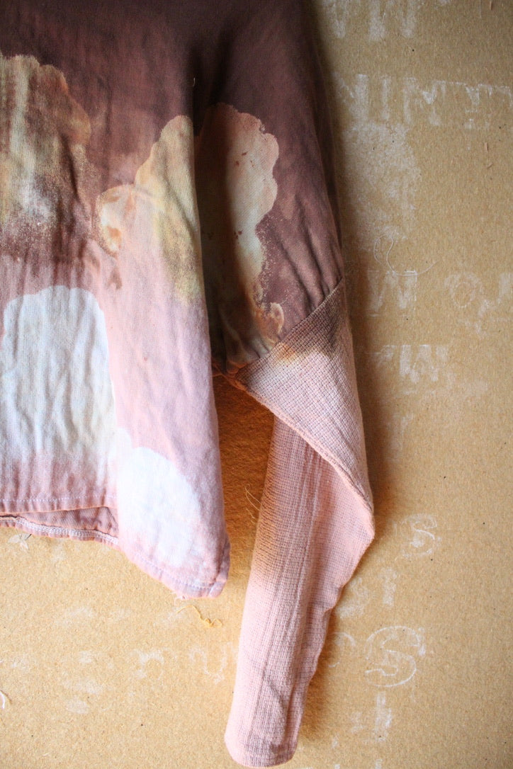 Medium - OOAK - Muave CLoudy Sky Slouchy Long Sleeve Top -Integration- 100% Heavy weight triple layered Cotton Gauze - Feather trim shoulders- Slight Crop. Vintage hmong hilltribe vietnamese patch hand woven
